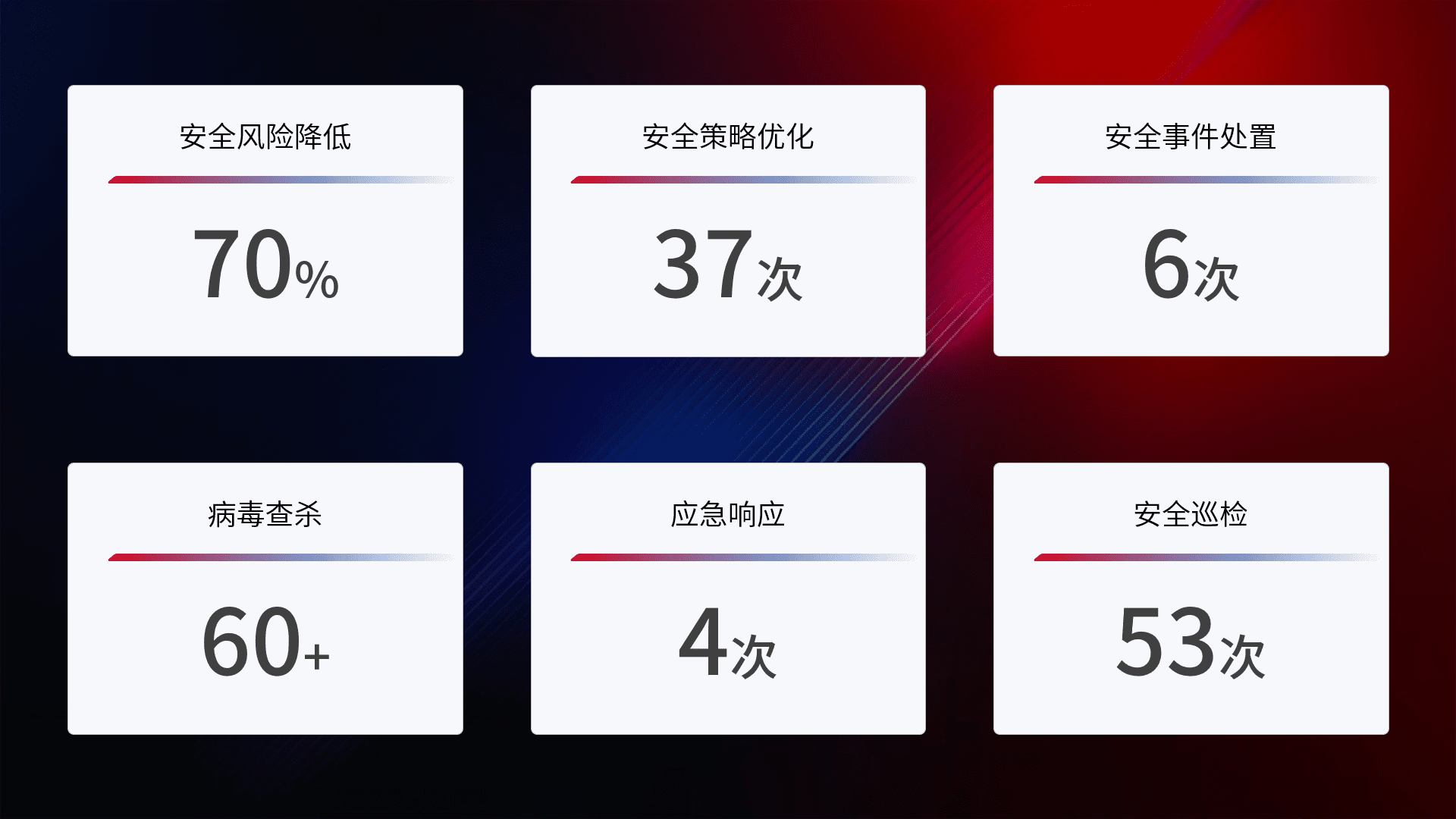 提供全面的安全事件报告体系,,,,包括处置报告、、、周报、、季度和年度总结,,,结合持续监控,,帮助客户深入了解网络安全状况。。