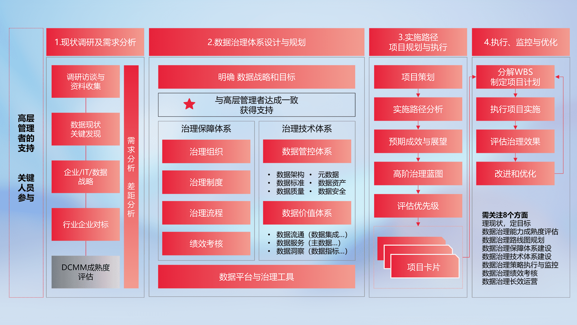 制定并执行统一的数据标准,,规范数据定义和格式,,,,消除冗余和不一致性,,,实现跨部门和跨系统的数据一致性,,,为企业提供标准化的数据基础。。